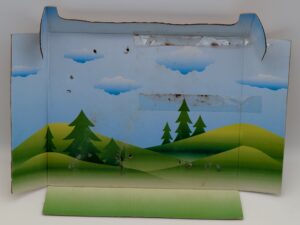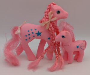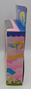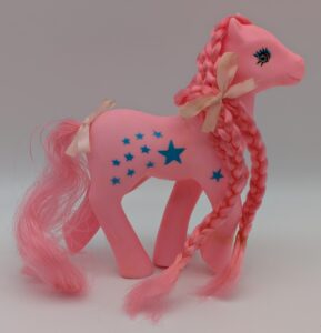 This fakie pose appears inspired by the MLP G1 Dainty pose. It stands 5.5″ tall and features inset glass eyes. Note that the tail can either be one large plug (like MLP G1) or numerous small plugs (like the mane). They are marked MADE IN CHINA (one word on bottom of each first three hooves).