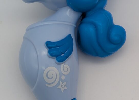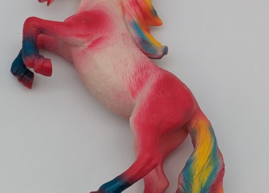 No markings. The adult is 2″ tall and the foal is 1.5″.